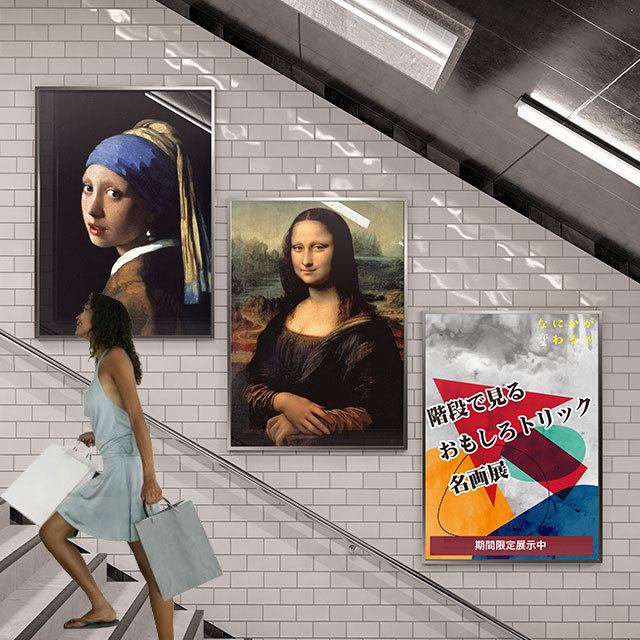 ベローズプリントアートは、見る角度を変えると絵が変わります。 レンチキュラーレンズを使わないため特殊な施工を必要とせず、どんな場所でも普通のポスターと同じように貼れます。