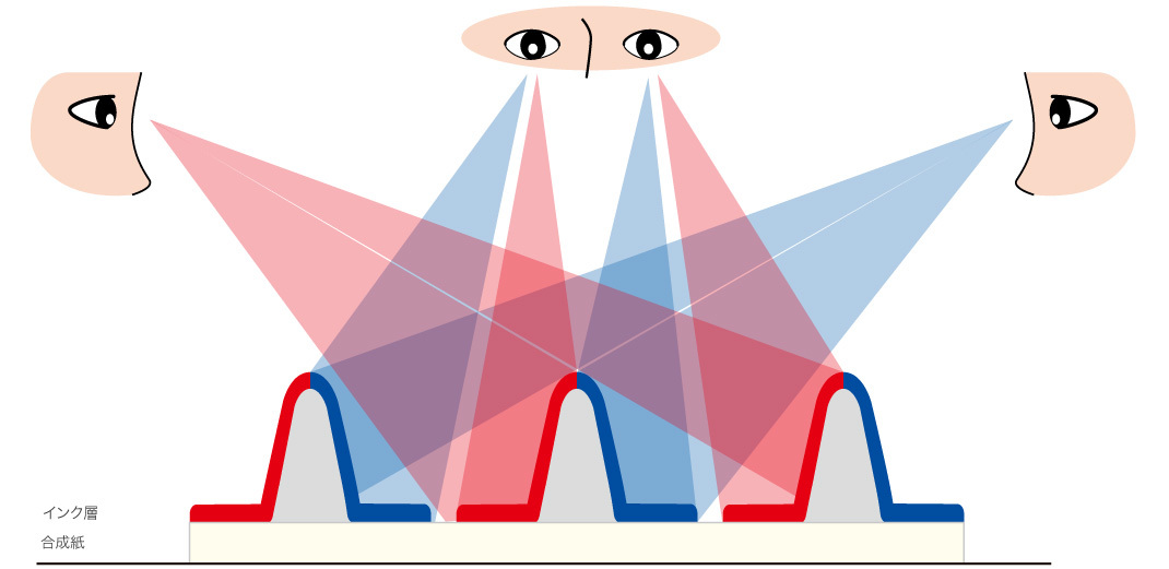 見る角度(左右・上下)を変えることで画が切替わるインクジェットプリント技術です。レンチキュラーレンズを使わず、積層印刷だけで完結することから大判出力に適し重量も軽く丸めての輸送や施工性に優れています。