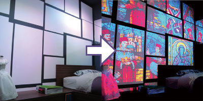 隠しデザイン出現の手段 | 後ろから光をあてる、透かす(内照式看板、タッチライト、太陽光、室内光) |