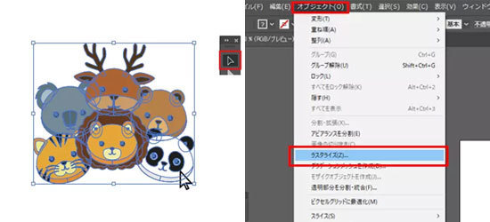 Adobe Illustratorで画像を配置し、対象オブジェクトを選択したら、メニューバーの「オブジェクト」→「ラスタライズ」をクリックします。設定は以下を参照してください。