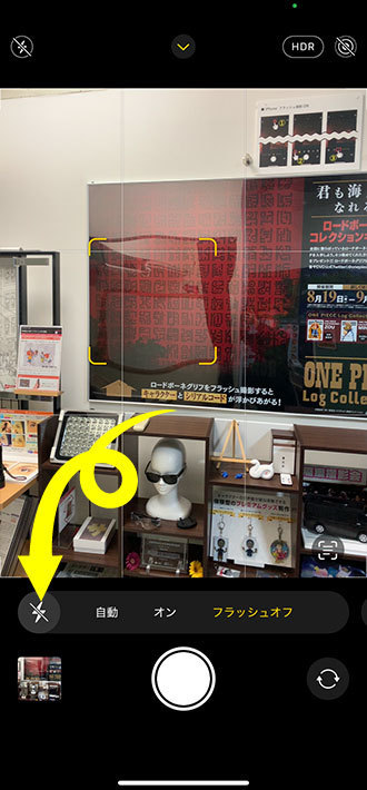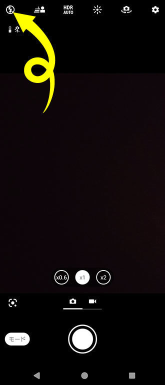 - カメラアプリを立ち上げ左上のフラッシュアイコンをタップし