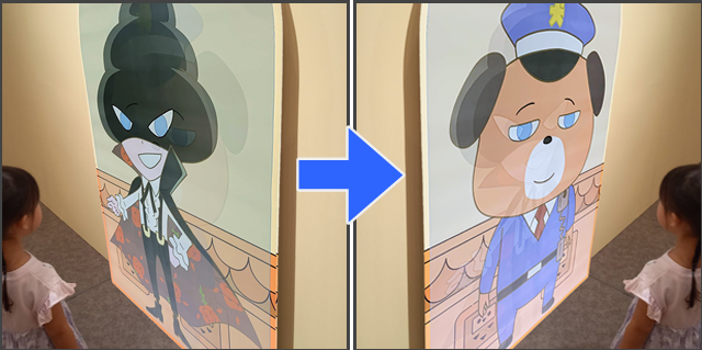 アニメ企画展の展示で「怪盗が正体を現す」というアニメの設定にちなんだ追体験が楽しめる仕掛けをベローズプリントで実現。訪れたファンの満足度を高めました。