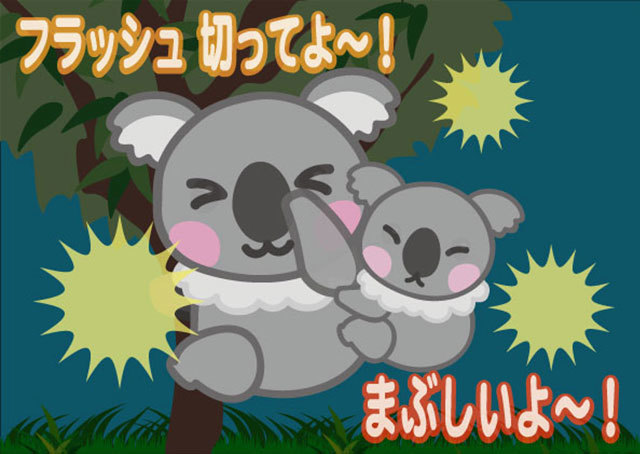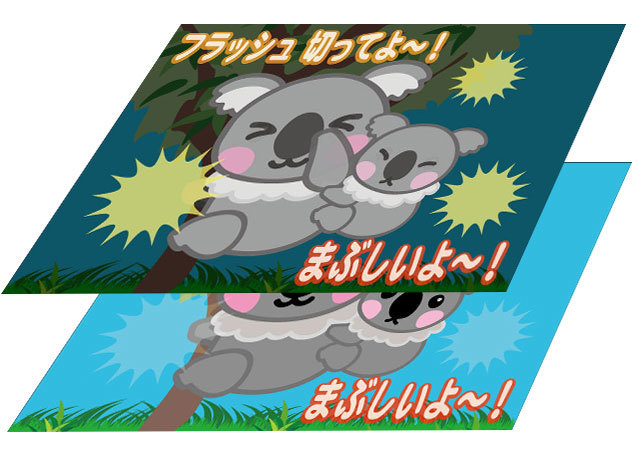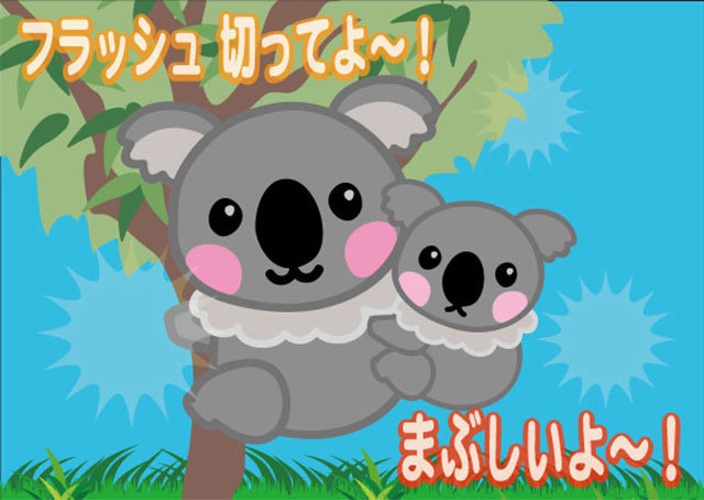 スマートフォンのフラッシュ撮影に反応して、動物が嫌がっているようなデザインに変化します。動物園や水族館の注意看板などで活用されています。