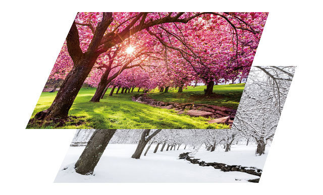 普段見せるデザインと隠すデザインをレイヤー分けします。肉眼で見せたい冬の景色は(2Cレイヤー)に配置し一般的な印刷で表現します。普段は隠れていて再起反射光をあてると現れる春の景色を(2CFレイヤー)に配置しフラッシュプリントで表現しています。