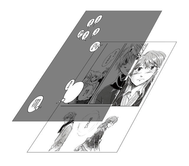 普段見せるデザインと隠すデザインをレイヤー分けします。常に見せたい漫画のキャラクターやセリフ部分は(通常用レイヤー)に配置し一般的な印刷で表現します。普段は隠れていて紫外線をあてると現れる想いの部分を(発光用レイヤー)に配置しブラックライトプリントで表現しています。
