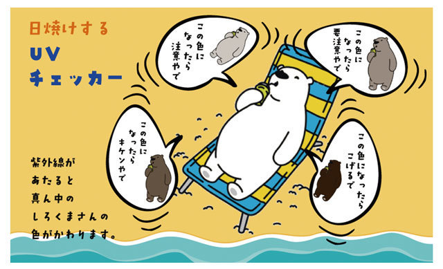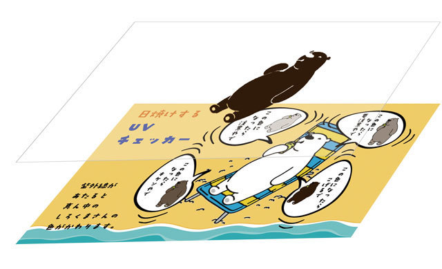 紫外線をあてるとまるで紫外線の影響で本当に日焼けするようなデザインへ変化します。紫外線を遮ると5分ほどで消色し元に戻ります。
