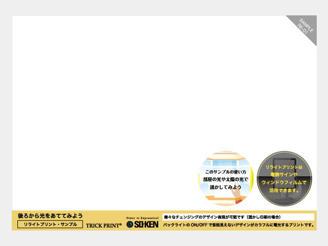 背面から光があたると隠れたデザインが現れる「リライトプリント」で上記の演出が実現可能です。背面の光が明るいほど元のデザインが逆光効果で見えなくなりデザインが変化したように見えます。