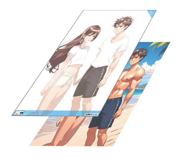 普段見せるデザインと隠すデザインをレイヤー分けします。Tシャツやホットパンツは最初に見せておきたいので(Oレイヤー)に配置し、一般的な印刷で表現します。普段は隠れていて水に濡れると現れる水着部分を(Uレイヤー)に配置しハイドロプリントで表現しています。