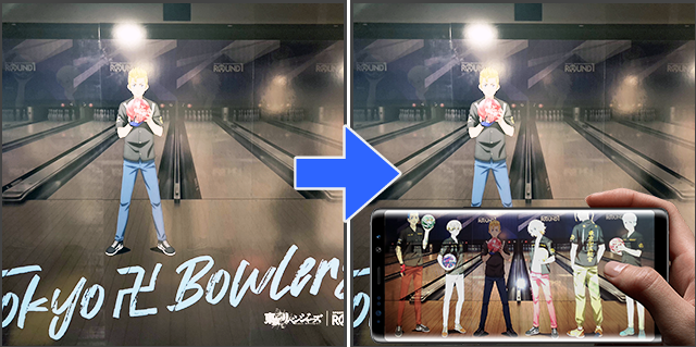 フラッシュ撮影するとキャラクターが現れる楽しい装飾演出で、ボーリング場で開催されたタイアップイベントを盛り上げました。