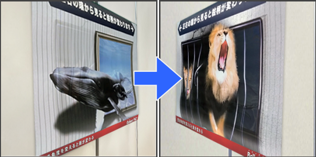 見る角度を変えることで、見えているデザインと異なるデザインへ変わる印刷技術です。