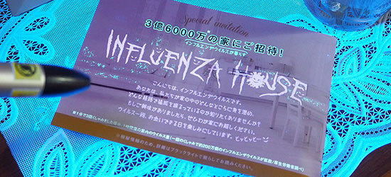 招待状の形式にしたPR投稿用の体験型アートで、ブラックライトを照らすと「雑菌が見えるような」疑似再現の仕掛けをブラックライトプリントで実現。PR投稿や除菌の必要性への興味関心を高めました。