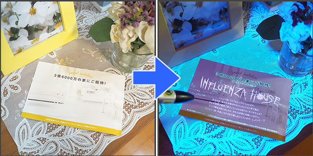 ブラックライトを照射することで、隠れたデザインが発光して見える印刷技術です。