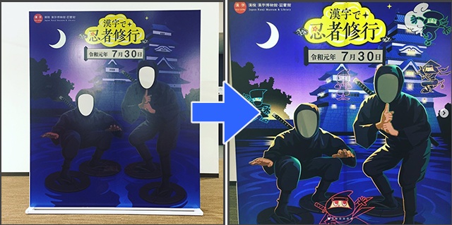 博物館で開催された忍者をテーマにした企画展における顔はめフォトスポットパネルで、フラッシュ撮影すると「忍者が現れる」ユニークな体験型アートをフラッシュプリントで実現。企画展を盛り上げました。