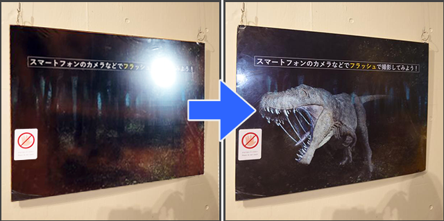 児童館の企画展の体験型アートで、フラッシュ撮影すると「恐竜が現れる」ユニークな体験が楽しめる仕掛けをフラッシュプリントで実現。来場者の満足度を高めました。