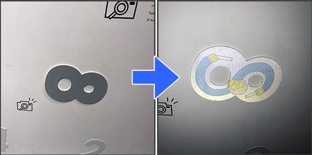 スマートフォンでフラッシュ撮影することで、見えているデザインと異なるデザインが写る印刷技術です。