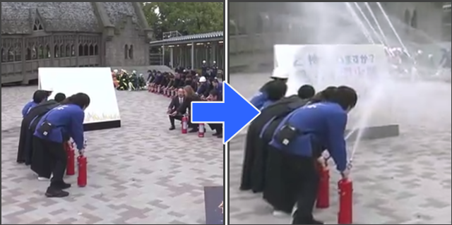 火災予防啓発イベントの体験型アートで、消火器からの消火剤がかかると「啓発メッセージが現れる」ユニークな演出をハイドロプリントで実現。話題性を高めました。