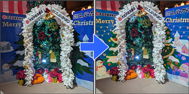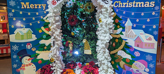 温泉施設のクリスマスイベントにおけるフォトスポット用バックパネルで、フラッシュ撮影すると「デザインが変わる」ユニークな体験型アートをフラッシュプリントで実現。クリスマスイベントを盛り上げました。