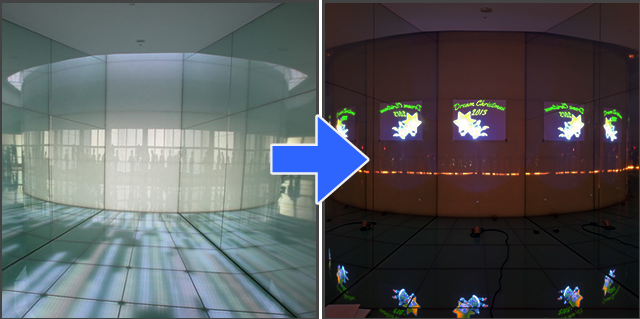 展望台のクリスマスイベントで、「マスコットキャラが浮かび上がる」という幻想的な演出をブラックライトプリントで実現。来場者の満足度を高めました。