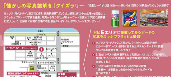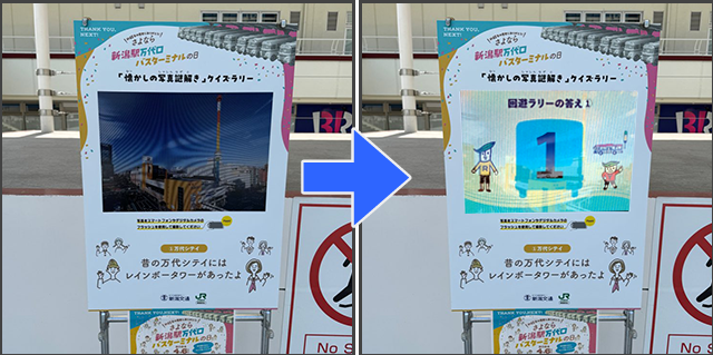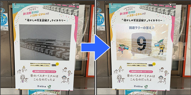 バスターミナル廃止にともなう惜別イベントで、キーワードラリーを開催。5つの箇所に設置された地元にまつわる懐かしの写真を撮影すると隠れたキーワードが浮かび上がる仕掛けをフラッシュプリントで実現し参加者を楽しませました。