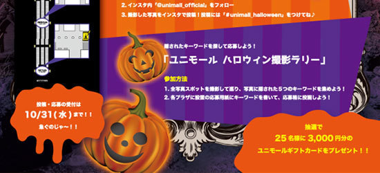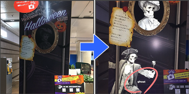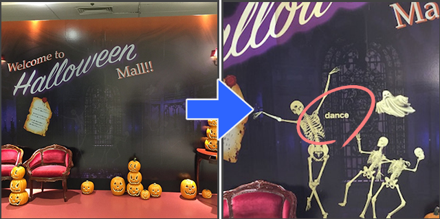 地下街のハロウィンイベントでキーワードラリーを開催。5つの箇所に設置された地元にまつわるフォトスポットを撮影すると隠れたキーワードが浮かび上がる仕掛けをフラッシュプリントで実現しキャンペーンを盛り上げました。