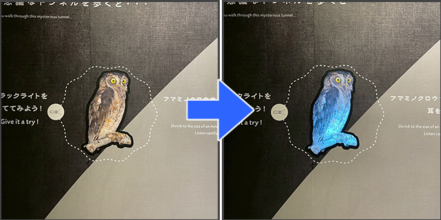 クロウサギを保護研究するミュージアムの展示装飾で、「クロウサギの目線で探検すると天敵が現れる」というミュージアムのコンセプトにちなんだユニークな仕掛けをブラックライトプリントで実現。来場者のエンゲージメントを高めました。