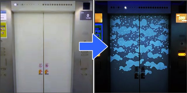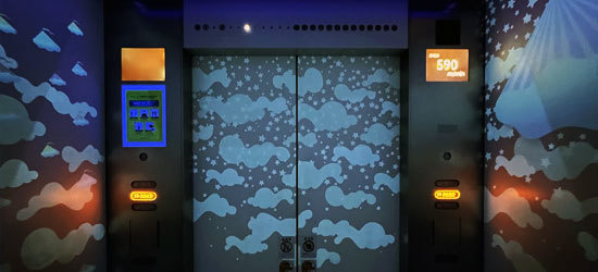 展望台のエレベーター内装で、ブラックライトが点灯すると「絵が現れる」ユニークな演出が楽しめる仕掛けをブラックライトプリントで実現。来場者のエンゲージメントを高めました。