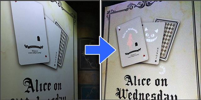 店舗の内装で、ブラックライトがあたる角度にドアを傾けると「不思議なことが起きる」ユニークな疑似再現が楽しめる仕掛けをブラックライトプリントで実現。来店客のエンゲージメントを高めました。