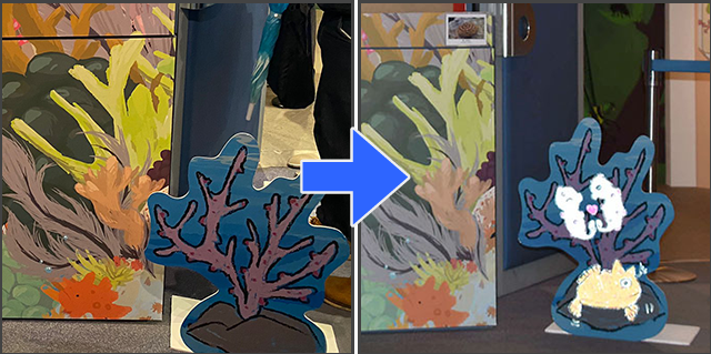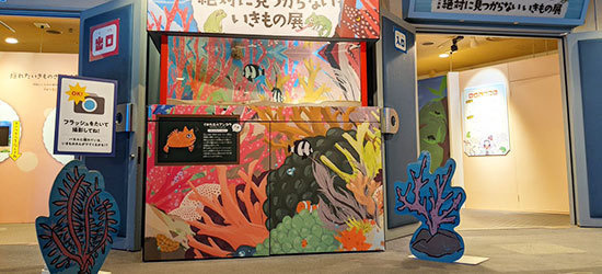 企画展の装飾で、フラッシュ撮影すると「擬態生物が現れる」ユニークな疑似再現が楽しめる仕掛けをフラッシュプリントで実現。利用客のエンゲージメントを高めました。