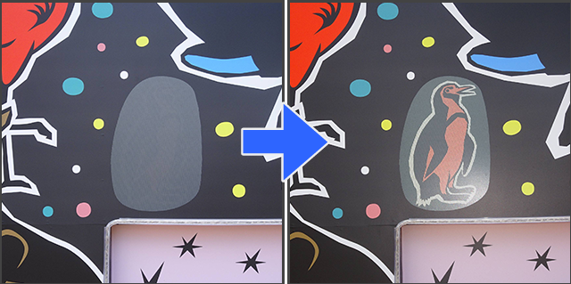 スマートフォンでフラッシュ撮影することで、見えているデザインと異なるデザインが写る印刷技術です。