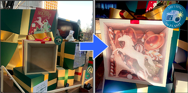 イルミネーションのクリスマス装飾で、フラッシュ撮影すると「絵が現れる」ユニークな体験が楽しめる仕掛けをフラッシュプリントで実現。ブランディングイメージを高めました。