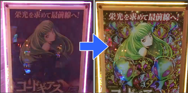 パチンコ店の店内看板で、後ろから光があたると「絵が変わる」ユニークな仕掛けをリライトプリントで実現。店内を盛り上げました。