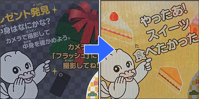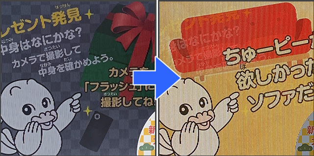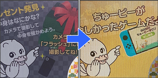 スマートフォンでフラッシュ撮影することで、見えているデザインと異なるデザインが写る印刷技術です。