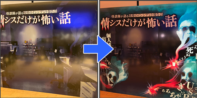 セミナーのフォトスポットで、フラッシュ撮影すると「幽霊が現れる」ユニークな疑似再現が楽しめる仕掛けをフラッシュプリントで実現。来場者のエンゲージメントを高めました。