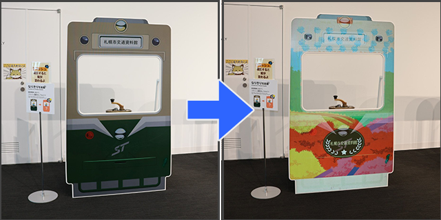 資料館のフォトスポットで、フラッシュ撮影すると「外装が変わる」ユニークな体験が楽しめる仕掛けをフラッシュプリントで実現。来場者のエンゲージメントを高めました。