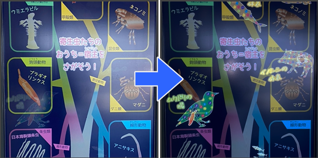 寄生虫館の常設展示でフラッシュONにして撮影すると寄生関係がわかるという、楽しみながら学べる仕掛けをフラッシュプリントで実現し、寄生虫学への関心を高めました。