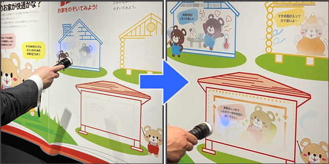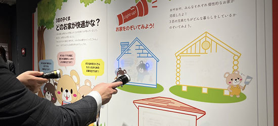 住宅展示場モデルルーム内の常設展示で、ブラックライトの紫外線をあてると「クイズの答えがだんだんと現れる」という断熱効果のある住宅にちなんだユニークな仕掛けをソーラープリントで実現し、住宅への関心を高めました。