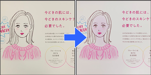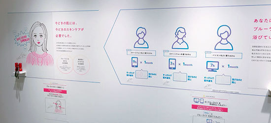 化粧品メーカーが開催したポップアップイベントの体験型展示で、ブラックライトの紫外線をあてると「肌がだんだんとダメージを受ける」、「クイズの答えが浮かび上がる」という商品にちなんだユニークな仕掛けをソーラープリントで実現し、来場者のエンゲージメントを高めました。