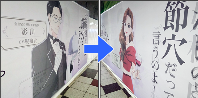 アニメ新作の告知を兼ねたOOHで、見る角度を変えると「主張が対立する」追体験を楽しめる仕掛けをベローズプリントで実現。ファンの熱量を高め、自然にUGCも生まれ拡散効果につながりました。