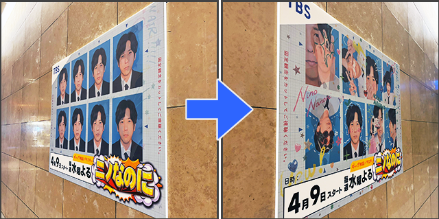 新番組の告知を兼ねたOOHで、見る角度を変えると「意外な一面が見れる」ユニークな体験を楽しめる仕掛けをベローズプリントで実現。ファンの熱量を高め、自然にUGCも生まれ拡散効果につながりました。