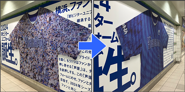 新ユニフォームの告知を兼ねたOOHで、見る角度を変えると「声援がユニフォームに変わる」ユニークな体験を楽しめる仕掛けをベローズプリントで実現。ファンの熱量を高め、自然にUGCも生まれ拡散効果につながりました。