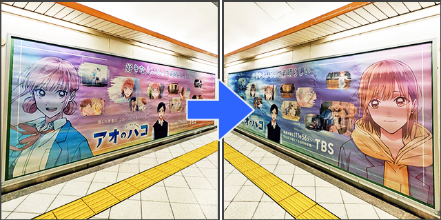 アニメ新作の告知を兼ねたOOHで、見る角度を変えると「それぞれの視点から見た」追体験を楽しめる仕掛けをベローズプリントで実現。ファンの熱量を高め、自然にUGCも生まれ拡散効果につながりました。