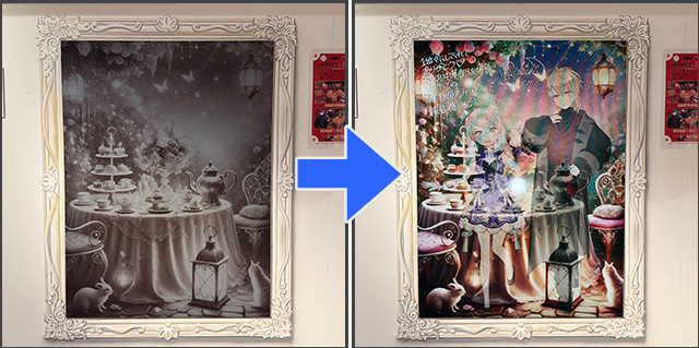 バーチャル配信アプリとエンタメ施設によるコラボ企画の体験型アートで、フラッシュ撮影すると「キャラと隠しメッセージが現れる」ユニークな演出をフラッシュプリントで実現。ファンの満足度を高めました。