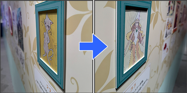 アニメ企画展の体験型展示で、見る角度を変えると「変身する」追体験を楽しめる仕掛けをベローズプリントで実現。ファンのエンゲージメントや没入感を高めました。