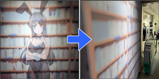 アニメ企画展の体験型展示で、見る角度を変えると「ヒロインが透明化する」追体験を楽しめる仕掛けをベローズプリントで実現。ファンのエンゲージメントや没入感を高めました。