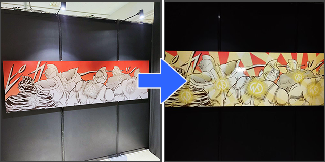 マンガ企画展の体験型展示で、フラッシュ撮影すると「証が光る」追体験が楽しめる仕掛けをフラッシュプリントで実現。訪れたファンのエンゲージメントを高めました。