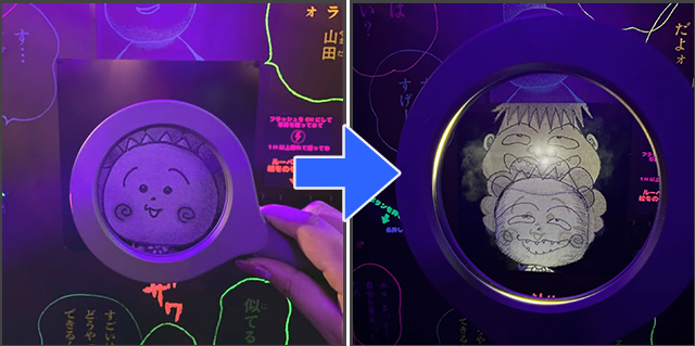 アニメ企画展の体験型展示で、LEDつき虫眼鏡で覗くと「不思議なことが起きる」追体験が楽しめる仕掛けをフラッシュプリントで実現。訪れたファンのエンゲージメントを高めました。