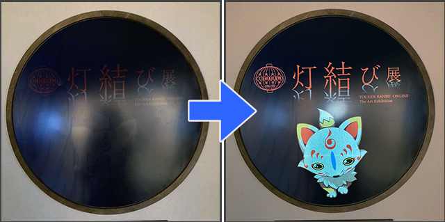 オンラインゲームが開催するオフラインイベント「灯結び展」の展示で「相棒的なマスコットキャラが灯で現れる」というイベント名にちなんだ体験が楽しめる仕掛けをフラッシュプリントで実現。訪れたファンの満足度を高めました。