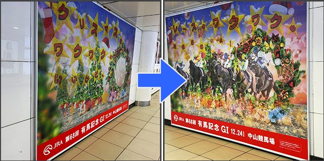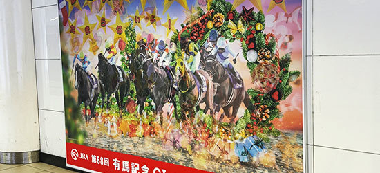 競馬G1レースのOOHで見る角度を変えると「絵とメッセージが変わる」ユニークな演出をベローズプリントで実現。話題性やファンの熱量を高めました。