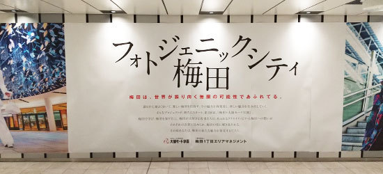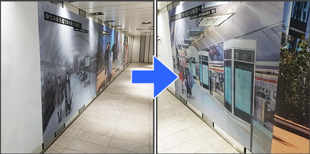 広告事業者と専門学校生による卒業制作アートのコラボという産学連携の取り組み、にぎわい創出の一環で掲出されたパブリックアートで、「その時代で最先端であり続ける」という地域のスローガンにちなんだユニークな演出をベローズプリントで実現。多くのメディアで取り上げられ、地域PRにつながりました。