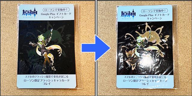 スマートフォンでフラッシュ撮影することで、見えているデザインと異なるデザインが写る印刷技術です。